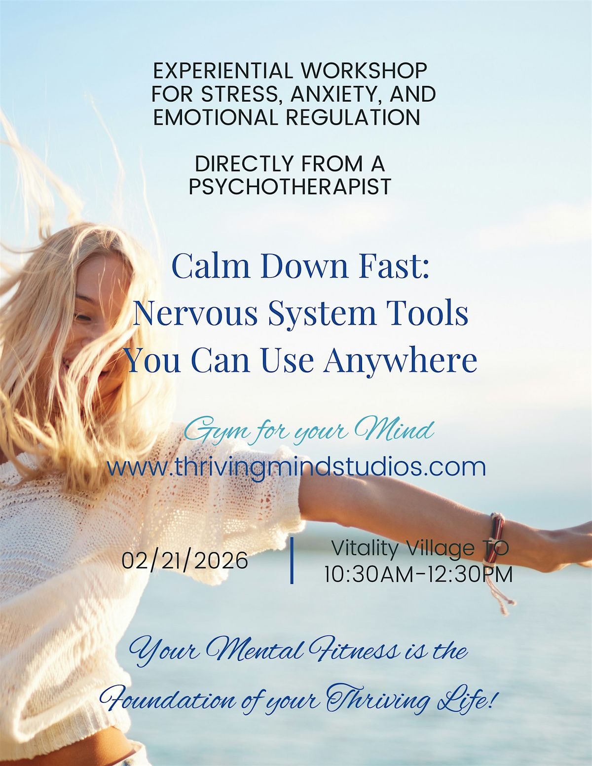 In this transformative 2-hour workshop, licensed psychotherapist and founder of Thriving Mind Studios, Elena Rybko, will teach you five powerful, science-based nervous system tools you can use anytime — at work, at home, at night, or in moments of anxiety.