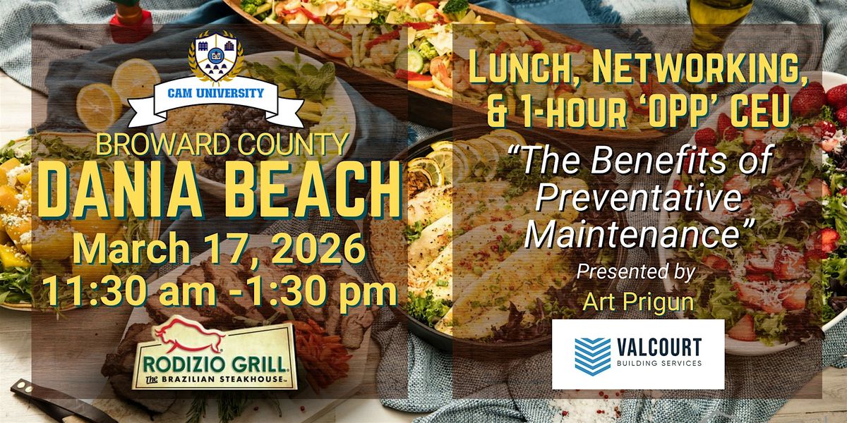 Join us for a fabulous lunch at Rodizio Grill and hear from Art Prigun of Valcourt as he presents a 1-hour 'OPP' CEU on "The Benefits of Preventative Maintenance." Get your CEU, network with great business partners, and have a fantastic lunch! 11:30 am - 1:30 pm