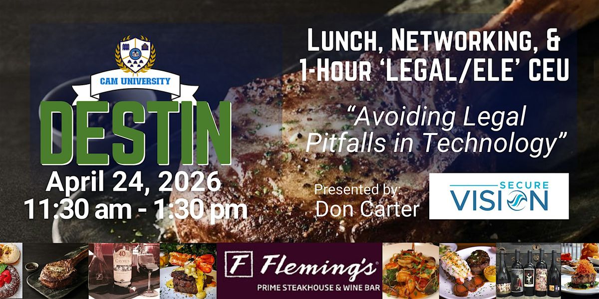 Join us for a fabulous lunch at Fleming's and hear from by Don Carter of Secure Vision as he presents a 1-hour 'LEGAL/ELE' CEU: "Avoiding Legal Pitfalls in Technology." Get your CEU, network with great business partners, and have an amazing lunch! 11:30 am - 1:30 pm