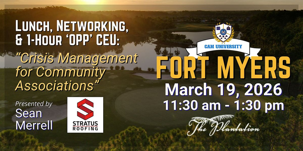 Join us at The Plantation Golf and Country Club in Ft. Myers on March 19 for a complimentary lunch plus networking, and a 1-hour "OPP" CEU by Sean Merrell of Stratus Roofing called "Crisis Management for Community Associations." Get your CEU, network with great business partners, and enjoy lunch and drinks! 11:30 am - 1:30 pm