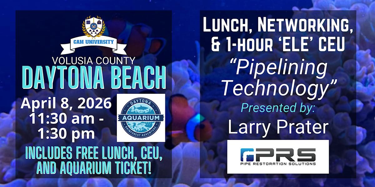 Join us for a fabulous complimentary lunch at Daytona Aquarium & Rainforest Adventure and hear from Larry Prater of Pipe Restoration Solutions as he presents a 1-hour 'ELE' CEU: "Pipelining Technology." Get your CEU, network with great business partners, and have an amazing lunch! 11:30 am - 1:30 pm