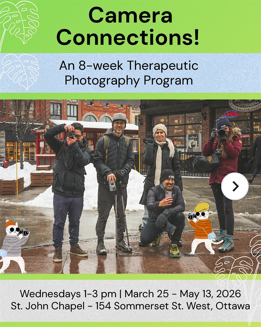 We will gather as a community of photography enthusiasts for 8 weeks of therapeutic photography activities at St. John the Evangelist chapel (154 Somerset Street West, Ottawa). The program runs on Wednesday afternoons from 1-3pm from March 25 to May 13, 2026. Meet your hosts: Caleb Ficner, Canadian Photographer & Mental Health Advocate and Renée Michaud, Multidisciplinary Artist & Registered Art Psychotherapist (Qualifying with CRPO).