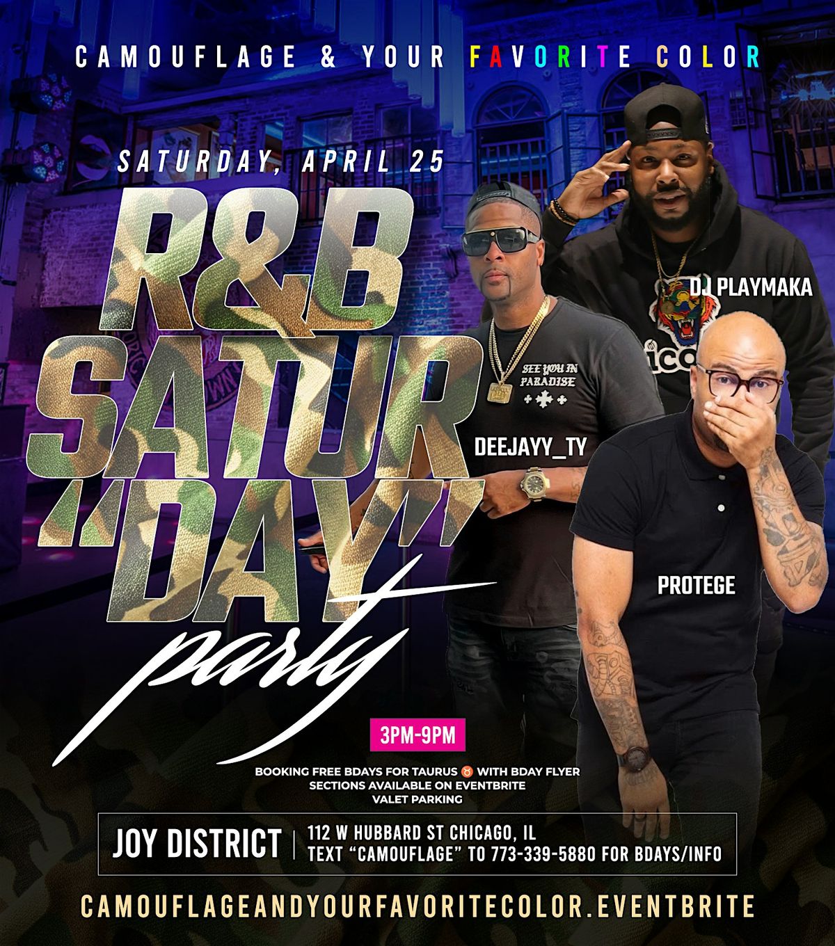 Pull up and pop out for the R&B “Day” Party on Saturday, April 25 — where smooth sounds, grown energy, and non-stop vibes take over the city. We’re mixing camouflage & your favorite color, so come styled, come confident, and come ready to turn heads all day long.