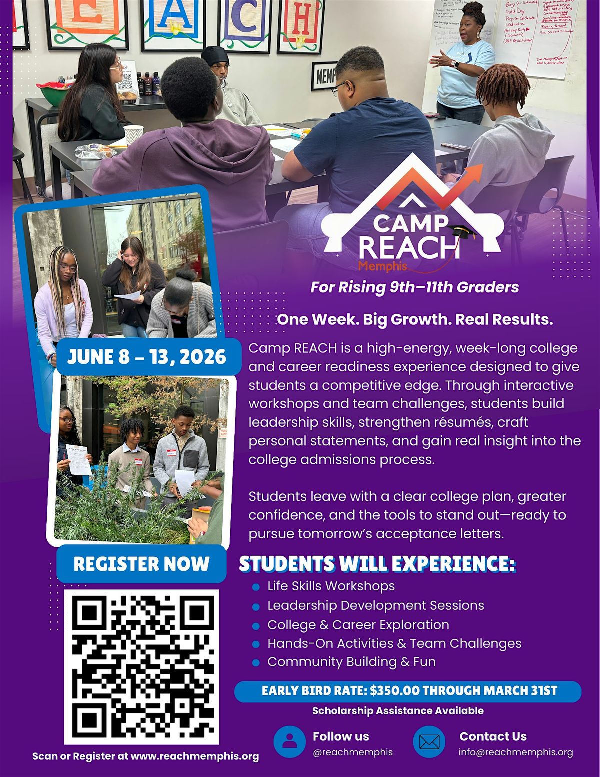Camp REACH is designed for students who are curious, motivated, and ready to grow — and we’re committed to making it accessible, with early‑bird pricing and scholarship support available.