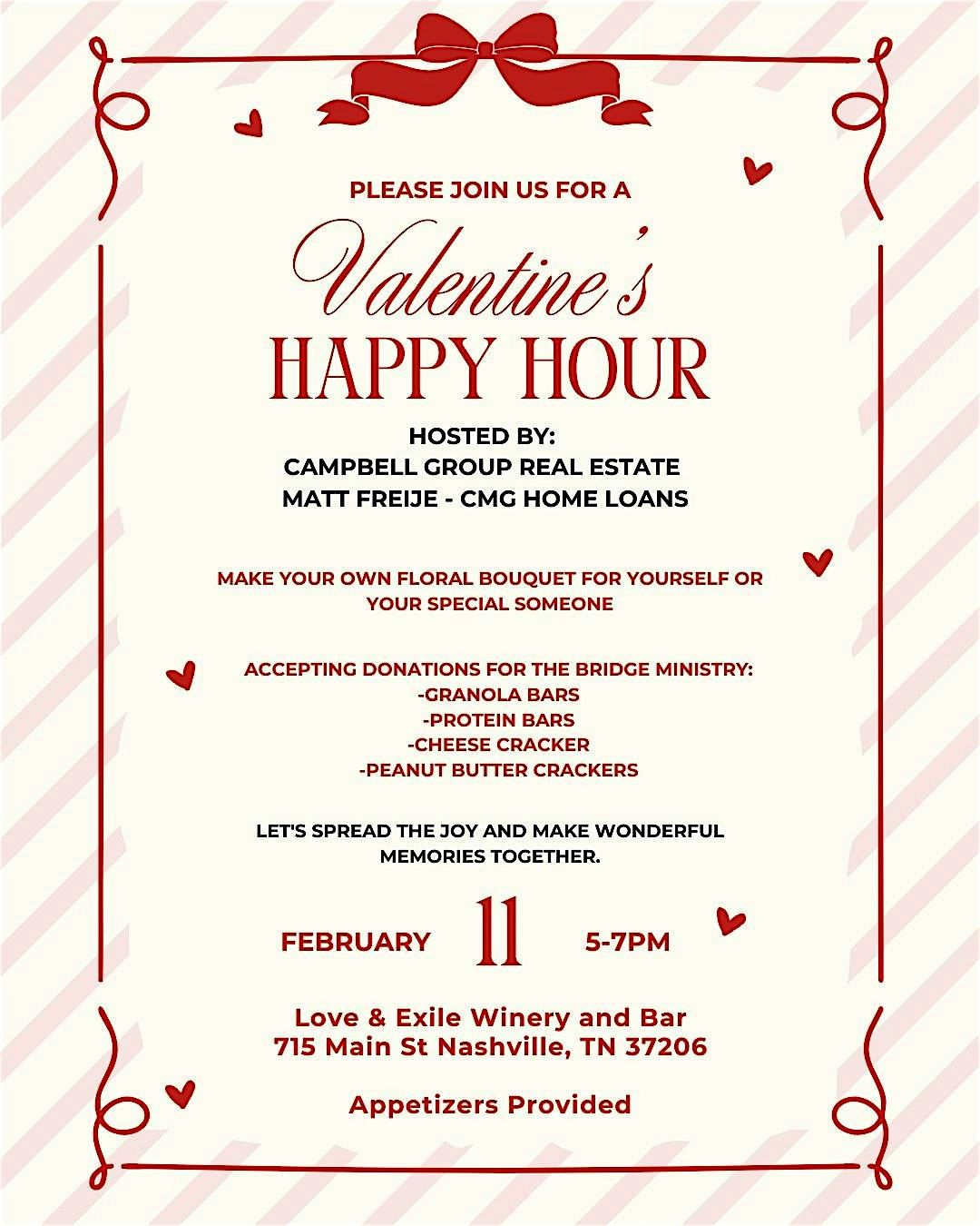 We will provide appetizers. We will have a DIY Floral Bar where you can make a floral bouquet to show love to yourself or someone special. We are accepting donations for The Bridge Ministry to show love to our underresourced and houseless neighbors. Granola Bars, Protein Bars, Cheese crackers and Peanut Butter Crackers. There is parking on site as well as street parking around. Sydney, Kimmy and Matt will be available for any questions about the housing market for 2026. Contact Sydney with any questions. 615-887-9957