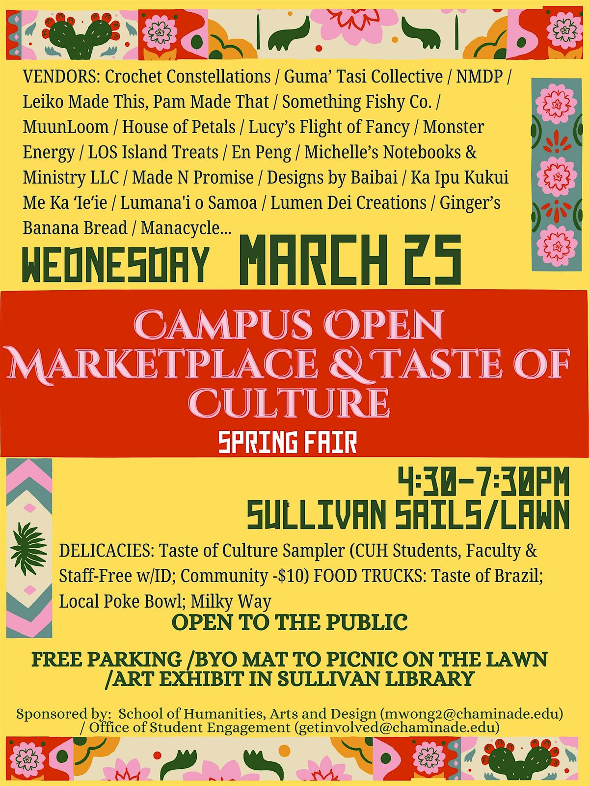 Come join us in person for a vibrant day of fun, food, and community vibes! Discover unique finds at the Open Marketplace, and savor delicious bites during the Taste of Culture. It's the perfect chance to mingle, explore, and enjoy some awesome flavors all in one place. Don't miss out on this lively campus event!