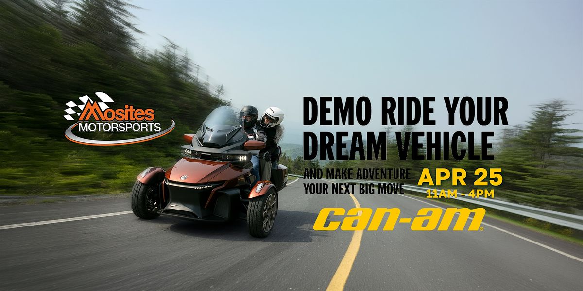 Join us at Mosites Motorsports West for an exclusive Can-Am Demo Event featuring the all-new 2026 lineup. This is your chance to get behind the handlebars and test ride the latest Ryker, Spyder F3, and Spyder RT.