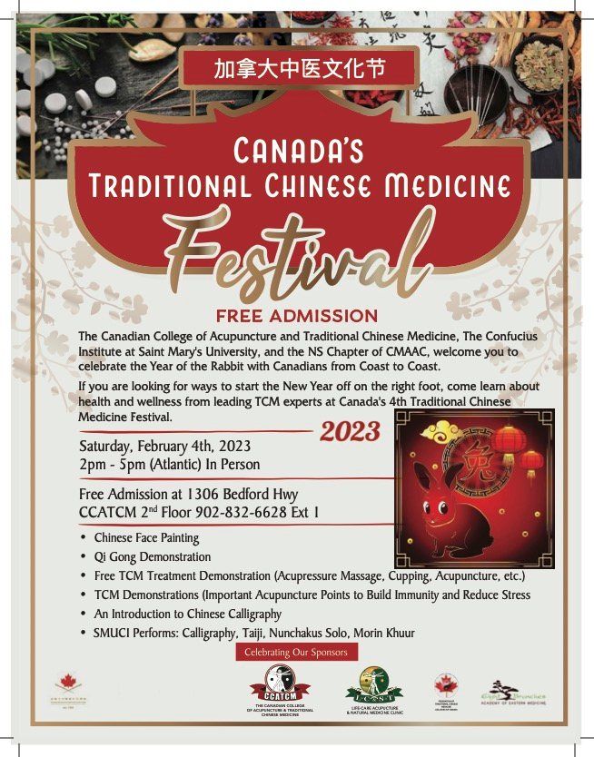 The Canadian College of Acupuncture and Traditional Chinese Medicine, The Confucius Institute at Saint Mary's University, and the NS Chapter of CMAAC, welcome you to celebrate the Year of the Rabbit with Canadians from Coast to Coast.If you are looking for ways to start the New Year off on the right foot, come learn about health and wellness from leading TCM experts at Canada's 4th Traditional Chinese Medicine Festival.