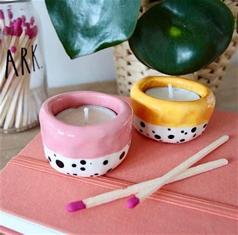 Create unique tea-light candle holders with clay. Beginners are welcome! We make our pottery classes easy for new clay artists.