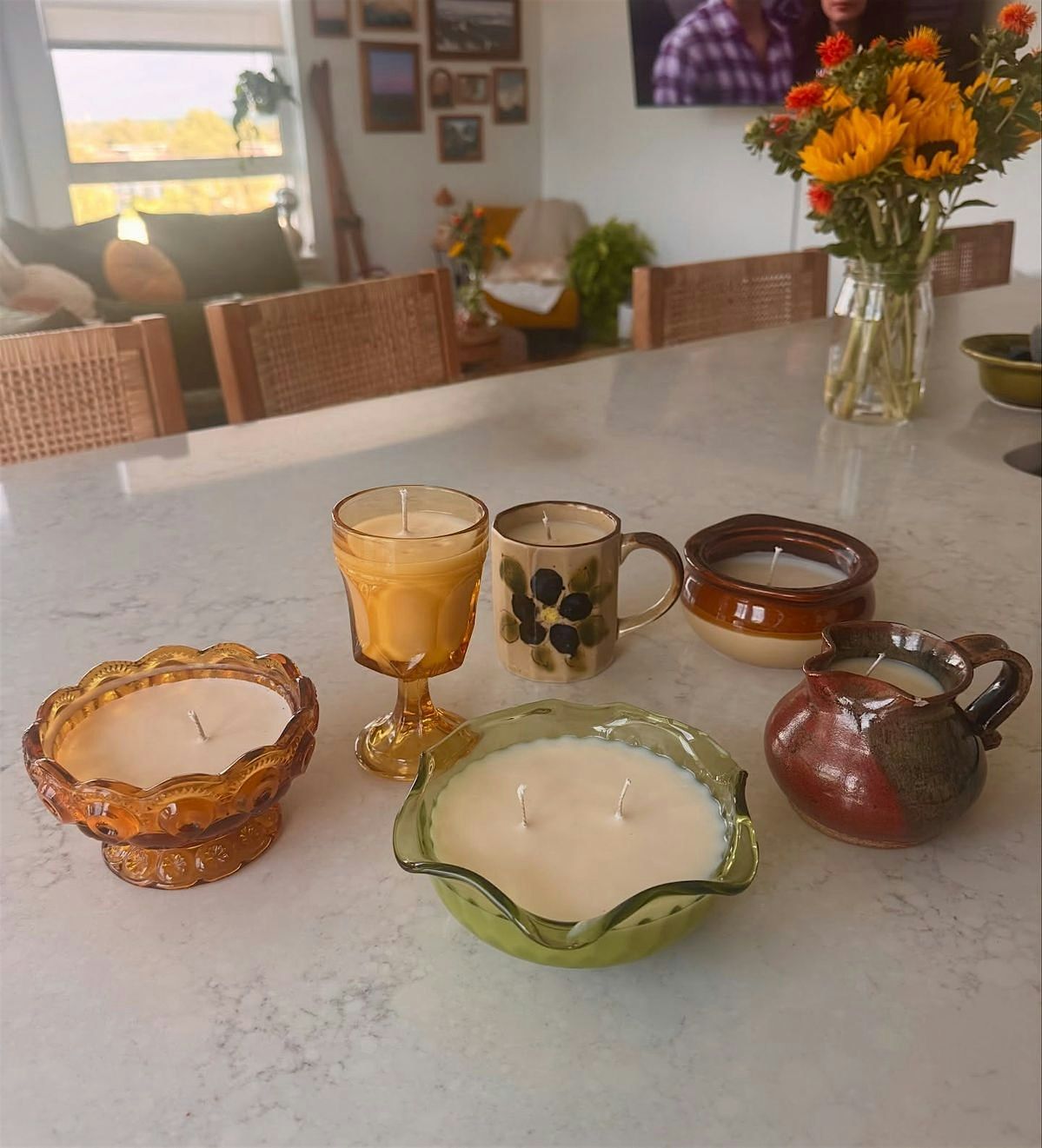 - Your choice of a curated secondhand vessel for your candle (tea cups, crystal dishware, etc.)