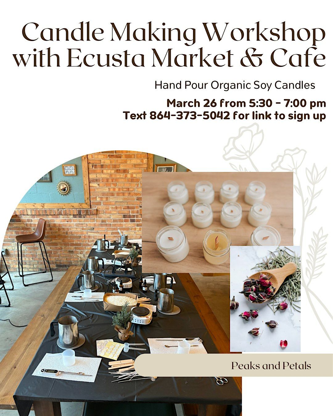 The class is an hour and half long. You will learn an overview of candle making and organic soy wax facts. Then you'll learn how to hand pour your own candles, mix oils and add florals. You'll also get to decorate your lid and be creative! no prior experience needed.