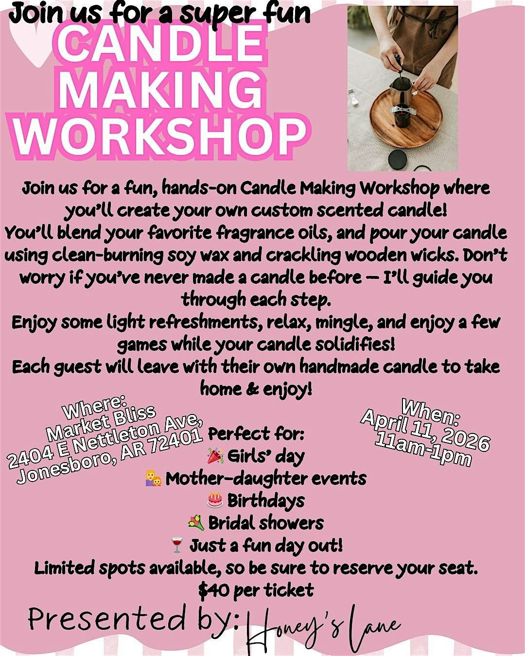Hey there! Join us in person for a super fun Candle Making Workshop. Whether you’re a total newbie or just want to get creative, this hands-on session will be super fun. Expect lots of laughs, cool scents, and a cozy vibe. Don’t miss out on making something beautiful and unique with your own hands!