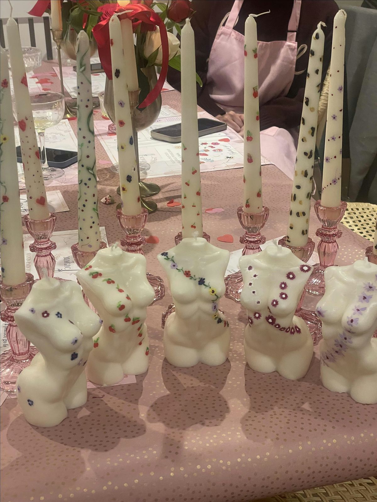 you will paint a 15 cm handpoured Venus torso candle along with 2 x 7 hr burn tapered dinner candles to complete the set