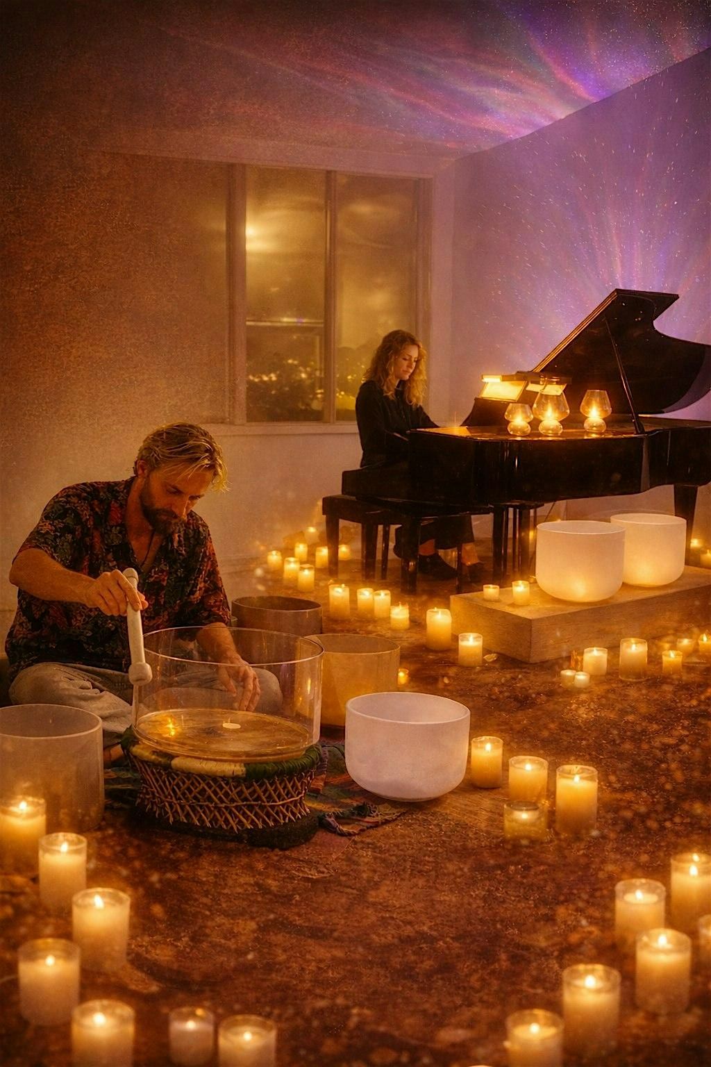 Mary Dreams on piano tuned to 432Hz and Charlie Demere on singing bowls invite you into a live, candlelit sound journey where healing frequencies create an immersive experience of deep relaxation and harmony.