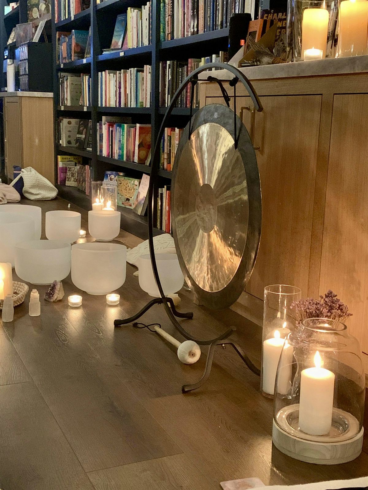 Your invitation to unwind under the new moon with soul soothing sound bath by candlelight in the beautiful, Mockingbird Books!