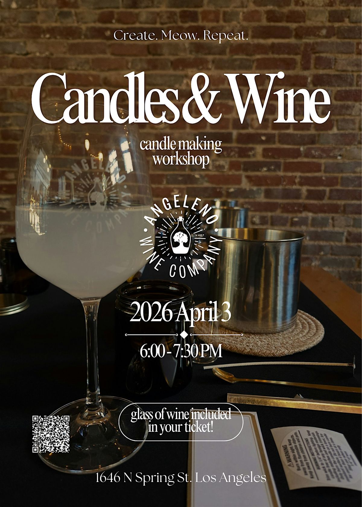 Join us for a hands-on candle making class at Angeleno Wine Company in dtla where you'll create your own clean burning coconut wax candle! Your ticket includes a complimentary glass of wine! Choose from a wide variety of non-toxic fragrances and learn about the process of creating a high quality candle from the CEO of Create. Meow. Repeat. LLC! You'll walk away with 1 7.5oz candle of your own creation in an amber glass jar and a custom label. The class will run for 1.5 hours where you'll have a chance to chat with your peers, sip on your wine, shop the Create. Meow. Repeat. candles (with recomended wine pairings!), get all your candle questions answered and wait for your candle to harden so you can take it home the same day! Sign up on your own or bring a friend, everyone is welcome, no experience necessary!