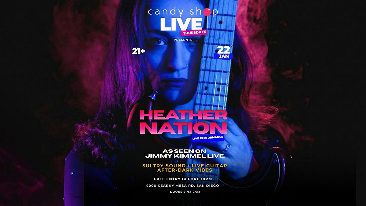 Join us at Candy Shop for Candy Shop Live Thursdays featuring Heather Nation, San Diego-based singer, songwriter, and guitarist, as seen on Jimmy Kimmel Live, blending indie, alternative, and R&B with live guitar and vocals.