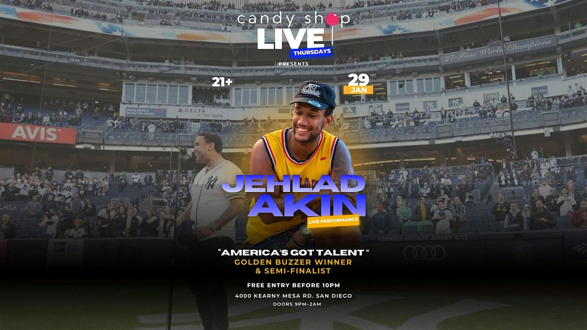 Join us at Candy Shop for Candy Shop Live Thursdays featuring Jehlad Akin, Golden Buzzer winner & semi-finalist on America’s Got Talent, performing R&B, Blues, hip-hop, and more!
