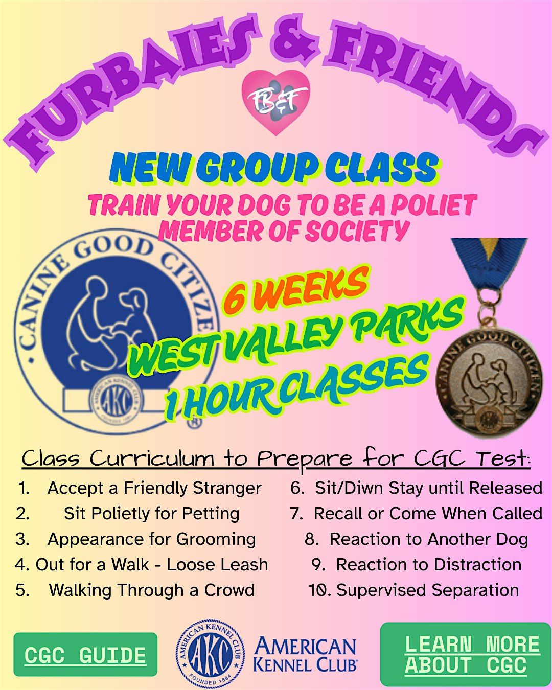 A well-trained, happy dog is a welcome member of the community.The goal of the class is to prepare you and your dog to take the Canine Good Citizen (CGC) test at the 6th & final class. Kristie, the positive reinforcement dog trainer, is an approved CGC Evaluator & will be administering the test.