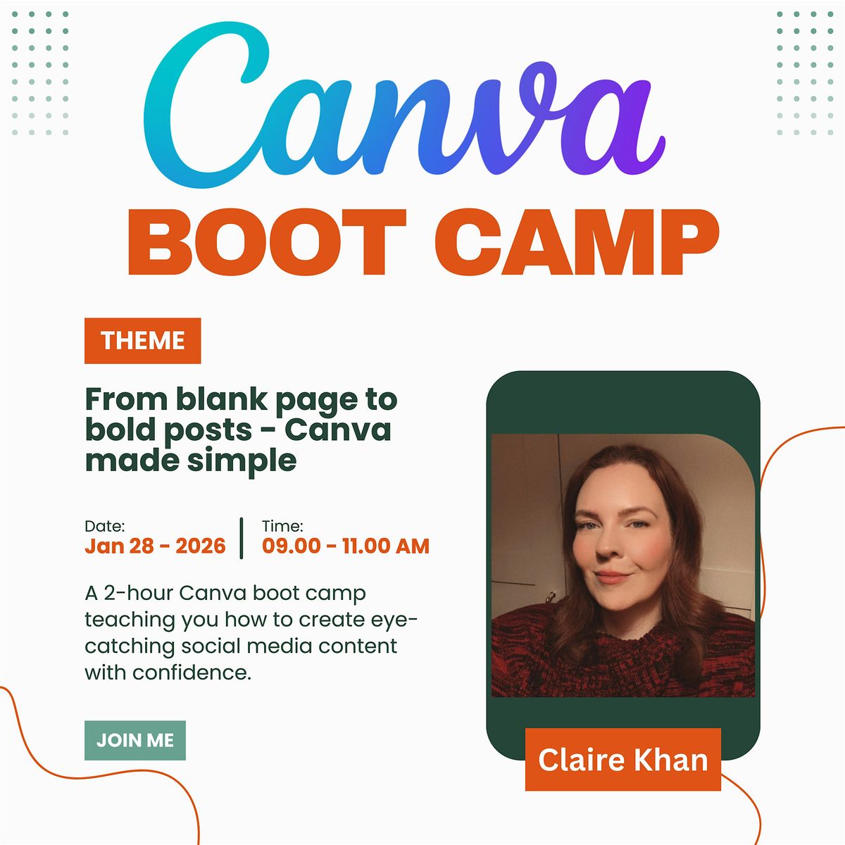 This 2-hour Canva Boot Camp is designed to walk you through the basics of using Canva for social media, perfect for beginners or anyone looking to refresh their skills. You’ll learn how to create eye-catching posts, understand layouts and branding, and discover helpful tips and tricks to streamline your workflow. By the end of the session, you’ll feel more confident designing content and able to create professional-looking social media graphics quickly and efficiently.