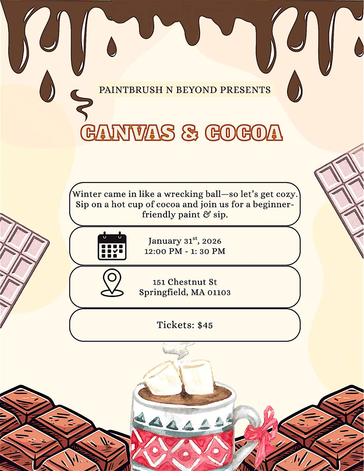 Enjoy a cozy atmosphere while sipping on delicious cocoa curated by a local vendor. No prior painting experience needed - just bring your creativity!