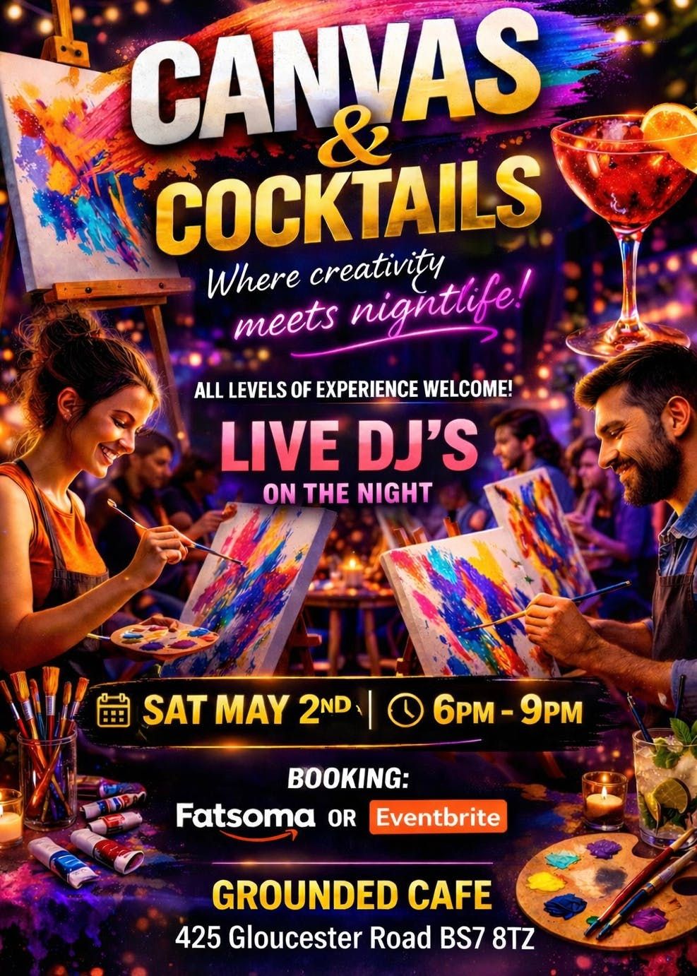 Canvas & Cocktails is a creative social event, so join us for a lively sip and paint experience designed for creativity, connection, and a little chaos. Paint along at your own pace, enjoy drinks, and soak in the energy of the room. There will be live DJs on the night playing the hottest tracks. No professional experience is needed, however we welcome professional painters.Whether you’re here to paint, sing, or just vibe, this is your night! Whether you’re with friends, on a date, with family or solo, this is an event you’ll enjoy.