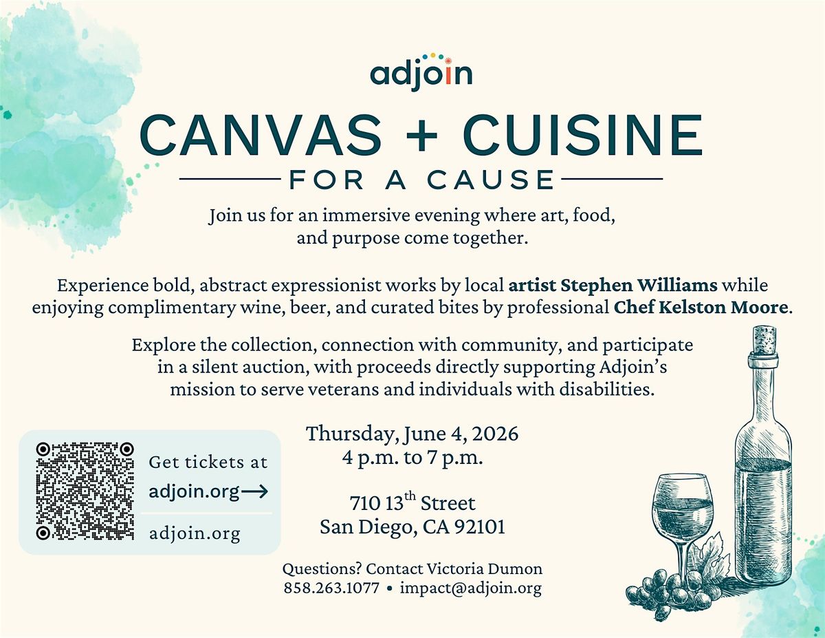 Adjoin is bringing together the community through canvas and cuisine at the stunning Hyangle Art Gallery in downtown San Diego. Join us for a night of visual storytelling, generous giving, and refined flavors, where every bite and brushstroke contributes to a greater cause.