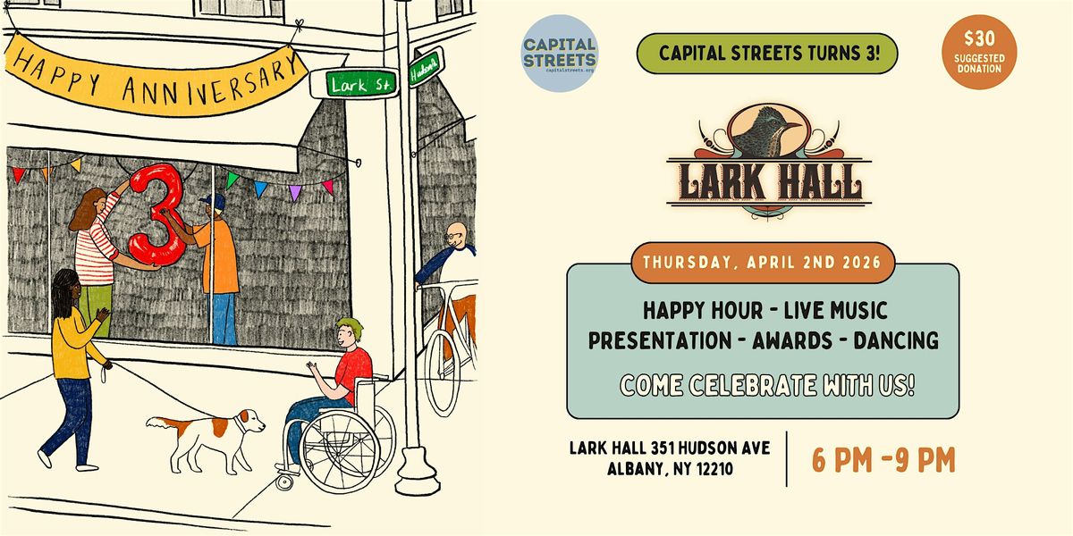 Join us on Thursday, April 2nd at Lark Hall from 6-9 PM to celebrate the work we are doing together to rebuild a more dynamic and walkable transportation system that makes life more enjoyable for everyone who lives in or visits the Capital District.