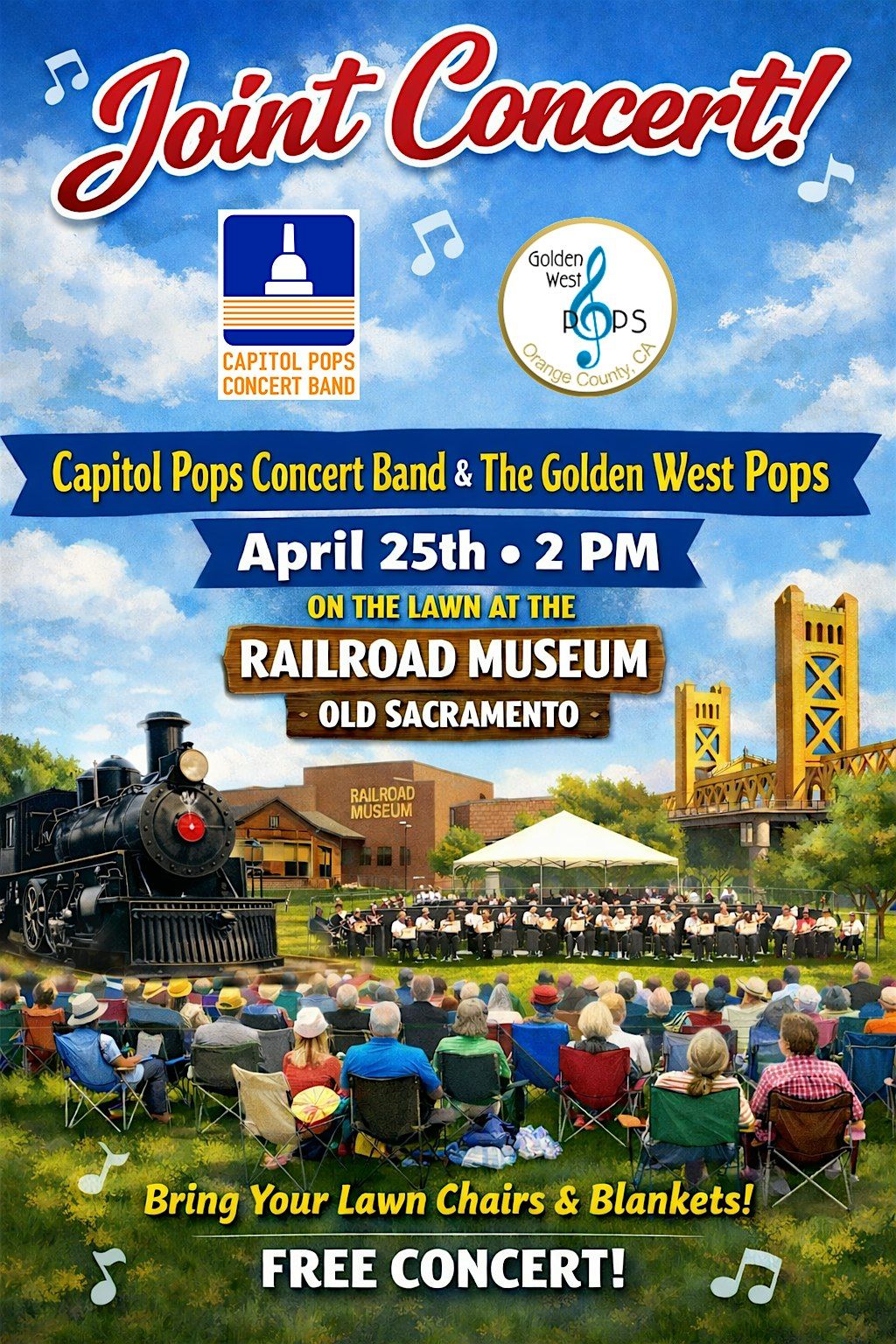 The Capitol Pops Concert Band and Golden West Pops are joining forces for a wonderful afternoon of live music, bringing neighbors, families, and music lovers together for a free outdoor concert on Saturday, April 25th at 2:00 PM on the lawn in front of the California State Railroad Museum in historic Old Sacramento.