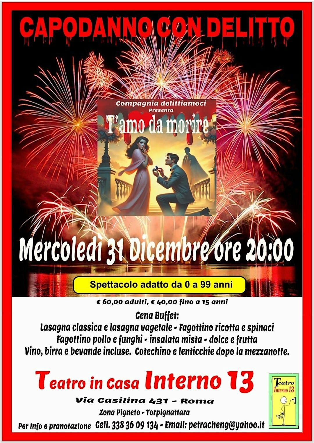 Il 31 dicembre dalle 20.00 nel Teatro in casa – Interno 13 (via Casilina 431 – zona Casilina – Torpignattara) ci sarà una serata speciale con delitto di e con Piera Fumarola e Aldo Gordiani dal titolo “T'amo da morire″.