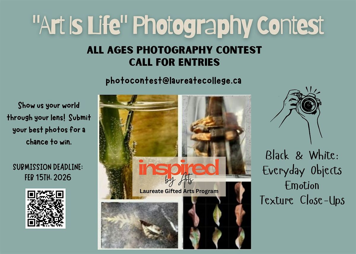 Art Is Life: Photography Contest by Laureate College – Open to All Ages. Show us your world through your lens! The Laureate College Gifted Arts Program invites photographers of all ages to enter the “Art Is Life” Photography Contest. Submit your best work in one of three expressive categories: