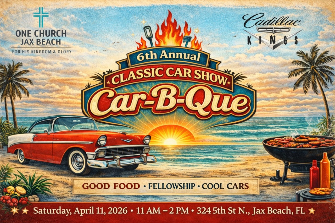 Don’t forget the incredible barbecue available for a $15 per plate suggested donation (to help fund summer camp for the students of One Church Jacksonville Beach). Cool cars, fun day and good food for the whole family! See you there!