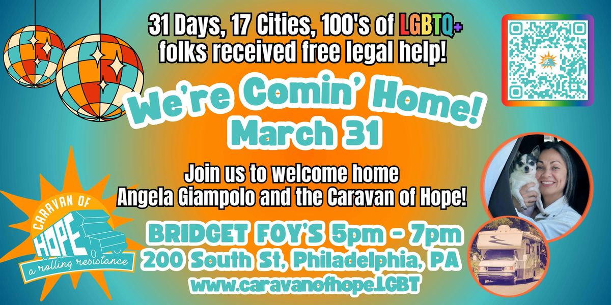 Join us in welcoming home Angela Giampolo and the Caravan of Hope team as we wrap up our cross-country mission right here in Philadelphia! We’ve spent the last month providing life-changing legal aid and spreading queer joy across the nation, and we want to toast to the journey with the community that started it all.
