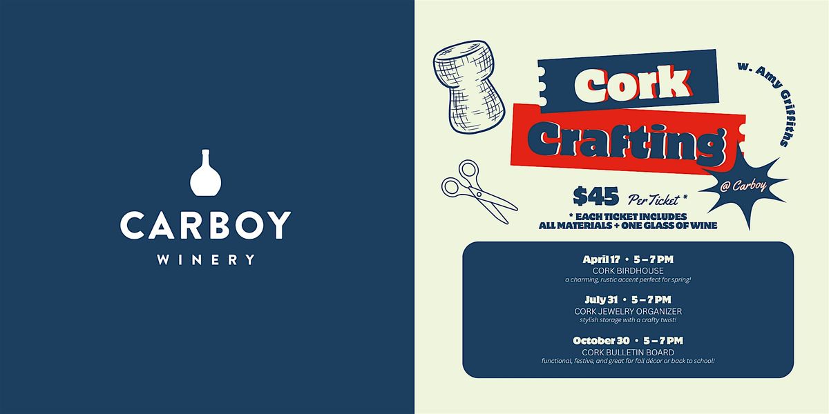 Uncork your creativity and get a little crafty with us! Join Carboy Winery for a hands-on Cork Crafting workshop led by local maker Amy Griffiths. Each Friday evening session features a unique, seasonal cork craft, perfect for adding a handmade, wine-inspired touch to your home.