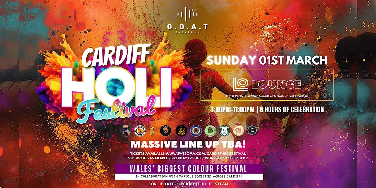 Wales' Biggest Holi Colours Festival is here, organised by G.O.A.T EVENTS UK IN PARTNERSHIP WITH VARIOUS SOCIETIES ACROSS CARDIFF!