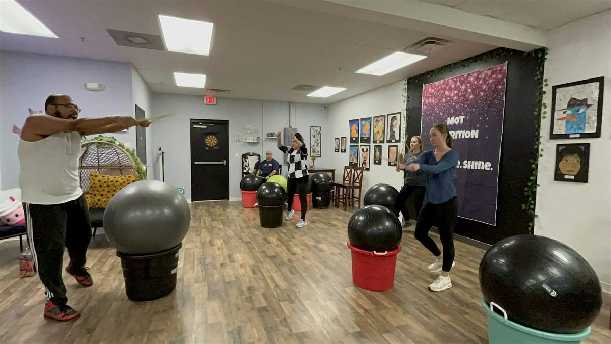This high-energy workout combines cardio, rhythm, and movement using drumsticks and stability balls—no experience needed.