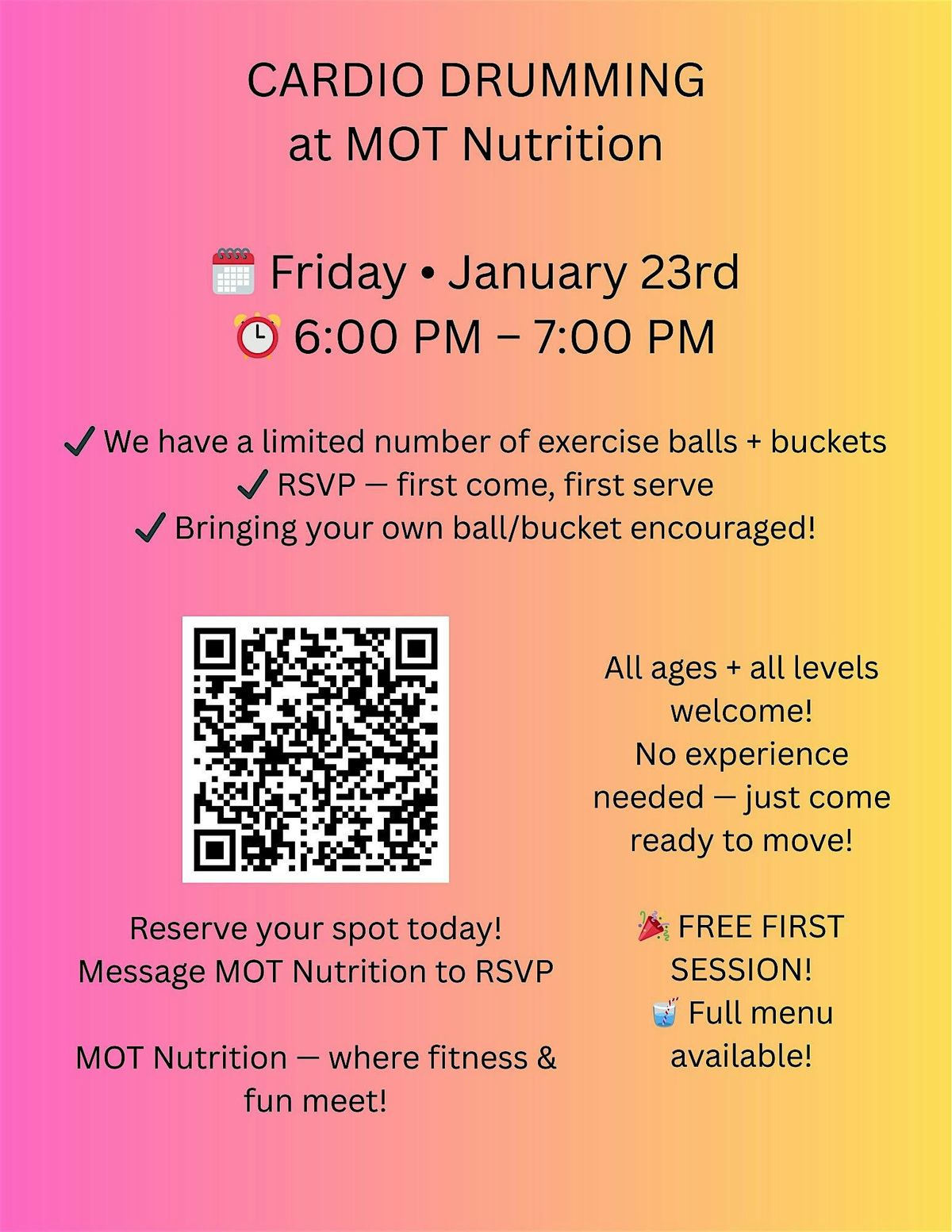 Looking for a fun way to move your body, boost your energy, and relieve stress? Join us for Cardio Drumming at MOT — a high-energy workout that combines rhythm, movement, and music to get your heart pumping and your mood lifted! No experience needed and all fitness levels are welcome.