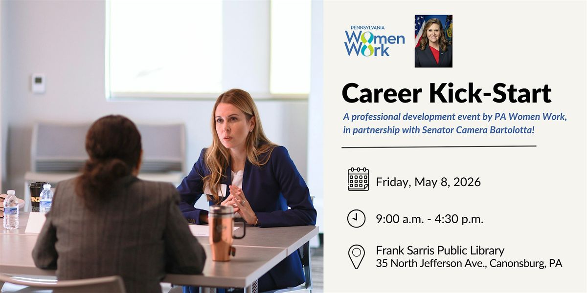 Presented by Pennsylvania Women Work, in partnership with Senator Camera Bartolotta, Career Kick-Start is designed to give job seekers the tools, confidence, and connections they need to take the next step in their career. Whether you're re-entering the workforce, changing careers, or actively applying, this hands-on workshop will help you determine and make a plan to achieve your career goals.