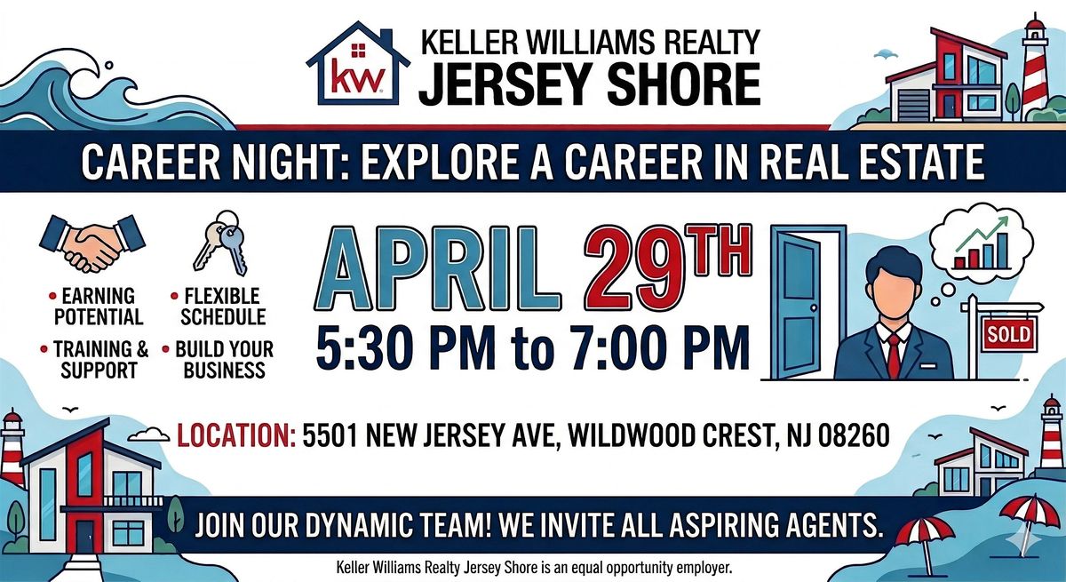 Join us for an exciting Career Night at Keller Williams Realty Jersey Shore on Wednesday, April 29th from 5:30 PM to 7:00 PM! Whether you're considering a new career in real estate or looking to grow within the industry, this is a great opportunity to learn more about what Keller Williams has to offer. The event will take place at 5501 New Jersey Ave, Wildwood Crest, NJ, where you'll meet experienced professionals, gain valuable insights, and explore your potential in real estate. The final 30 minutes of the evening will be dedicated to KSCORE applications, so come prepared to take the next step toward your future!