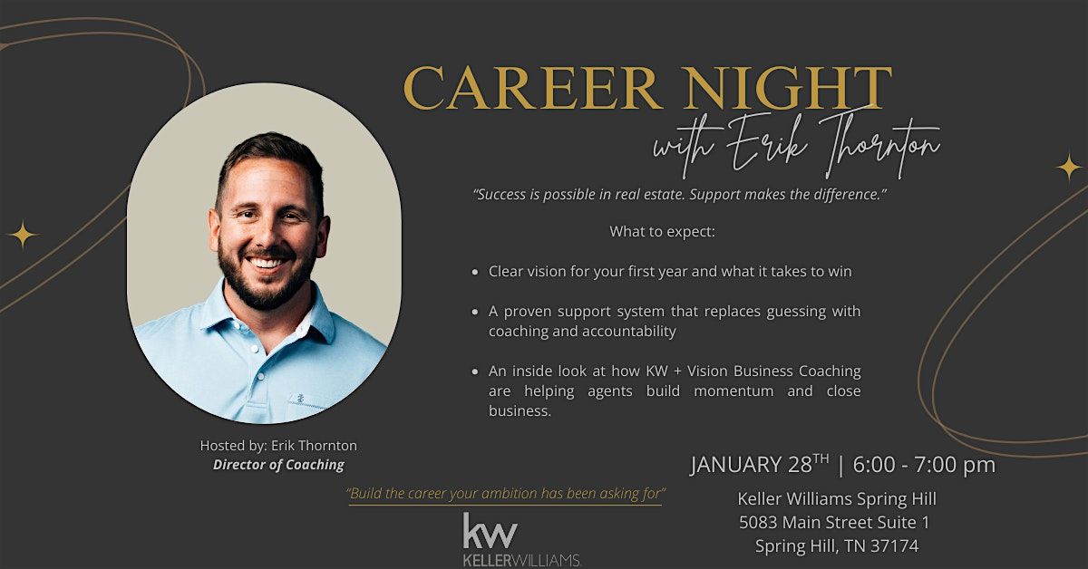 Career Night is a relaxed, informative event designed to give you a clear, honest look at what it takes to succeed in real estate and how the right support system makes all the difference.