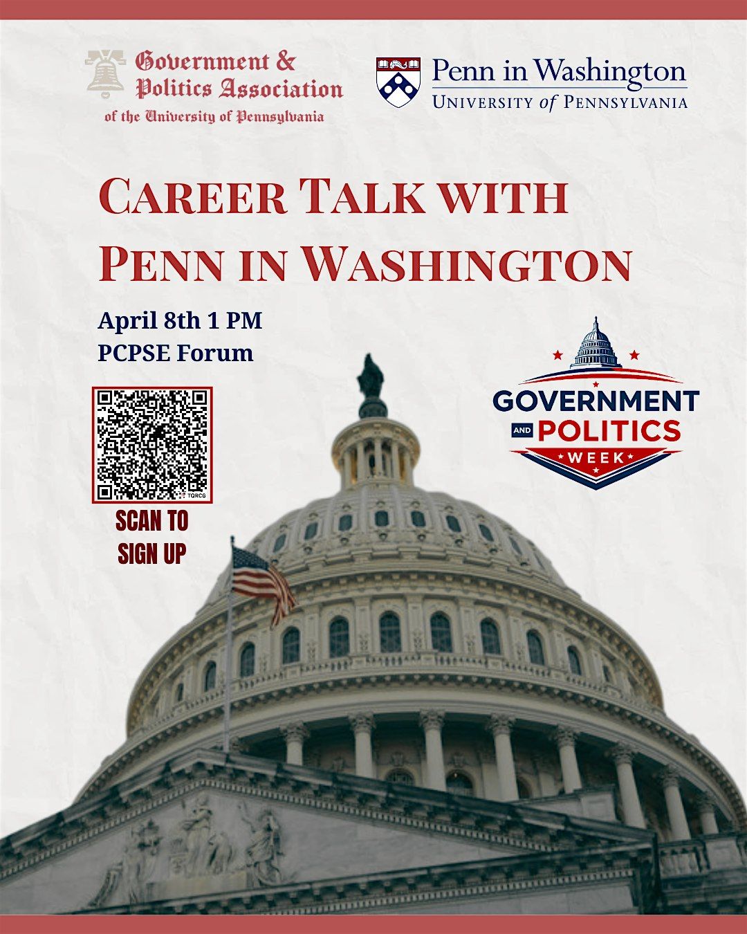 Join us at the Perelman Center for Political Science and Economics on April 8, 2026 at 1:00 PM (Eastern Time) for an event all about exploring government career paths. The experts of Penn in Washington, Liz Klein and Daniel Schneidermann, will talk about their experiences of serving in government. Don’t miss out on this great opportunity!