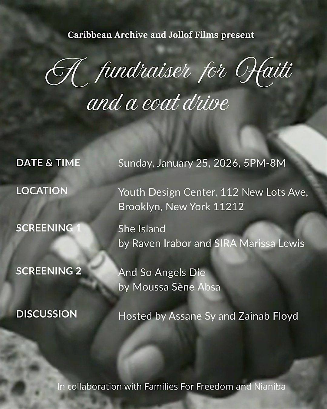 Caribbean Archive x Jollof Films presents “A Folkloric Poetic Journey to Contemporary Africa and the Caribbean.” A film screening, coat drive and fundraising event that provides material resources for recent African and Caribbean immigrant communities in New York City. The event champions African and Caribbean solidarity through a selection of a Trinidadian short film directed by Raven Irabor and SIRA Marissa Lewis titled She Island, and the West African feature length film, Ainsi Meurent Les Anges (And So Angels Die) directed by Moussa Sène Absa.