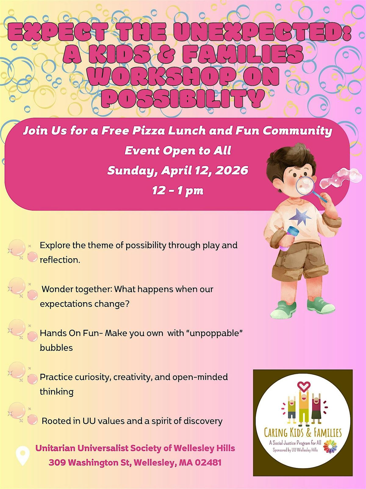 Join us at our next Caring Kids & Families event a free pizza lunch and hands-on fun as we explore possibilities through curiosity, conversation, and experiment with “unpoppable” bubbles!