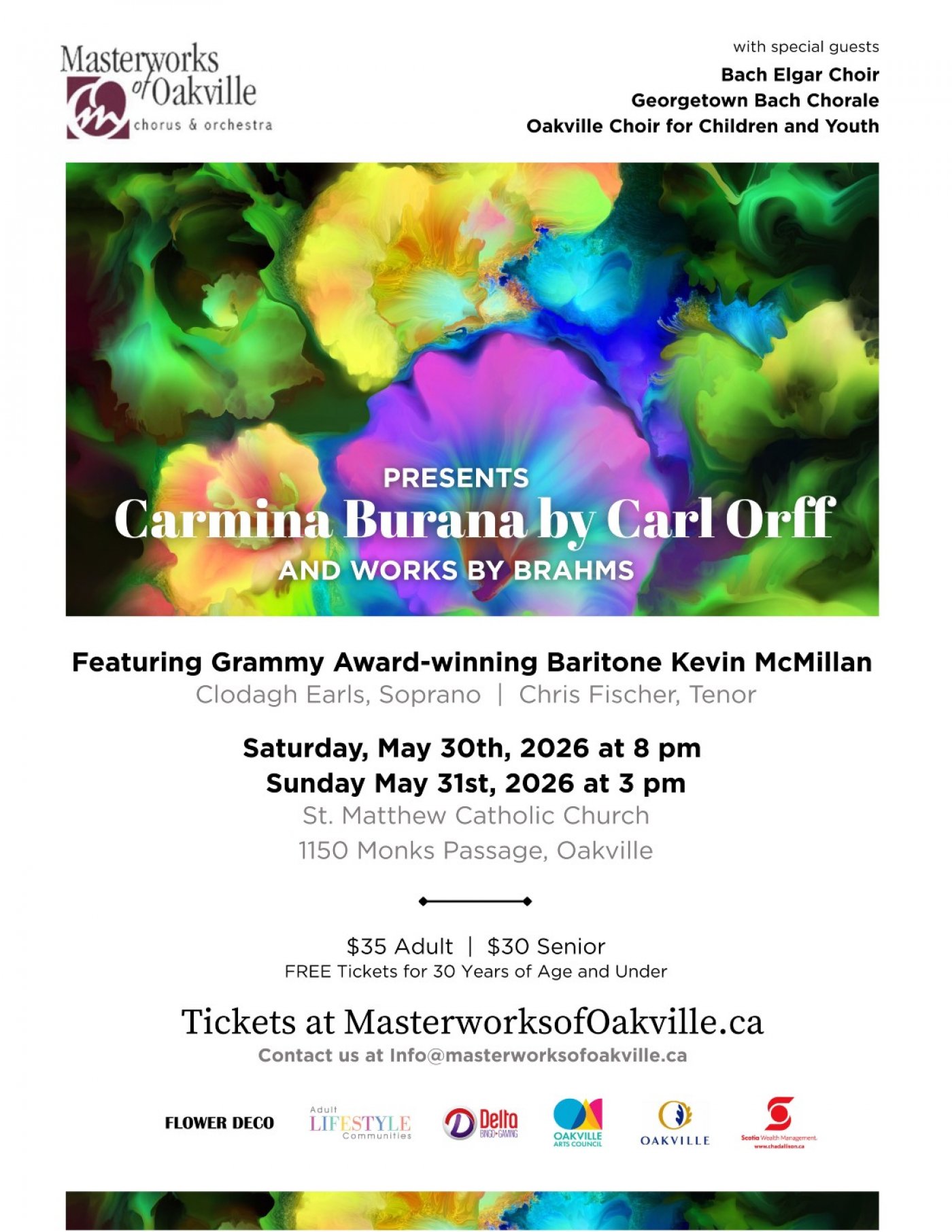 Experience the electrifying power of Carl Orff’s Carmina Burana in a truly extraordinary community collaboration. This monumental performance brings together a mass choir featuring Masterworks of Oakville Chorus & Orchestra, alongside the Bach Elgar Choir, Georgetown Bach Chorale, and the Oakville Choir for Children and Youth.