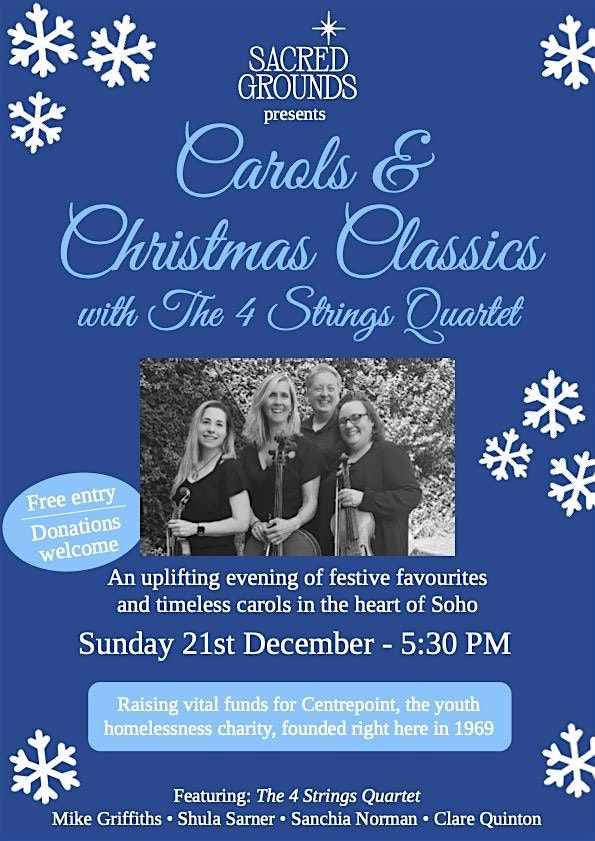 Join us at Sacred Grounds for a free string quartet performance of carols and Christmas classics