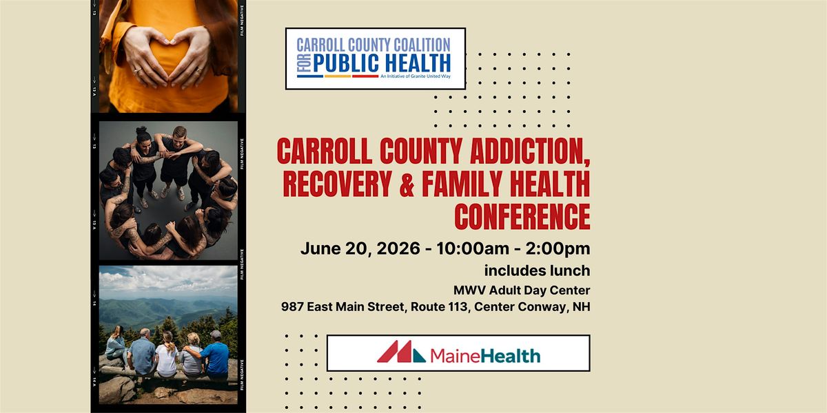 This community conference brings people together to talk openly about substance use, recovery, and how we can better support one another in Carroll County, NH. The goal is to increase understanding, reduce stigma, and encourage compassion for individuals, families, and communities affected by substance use.