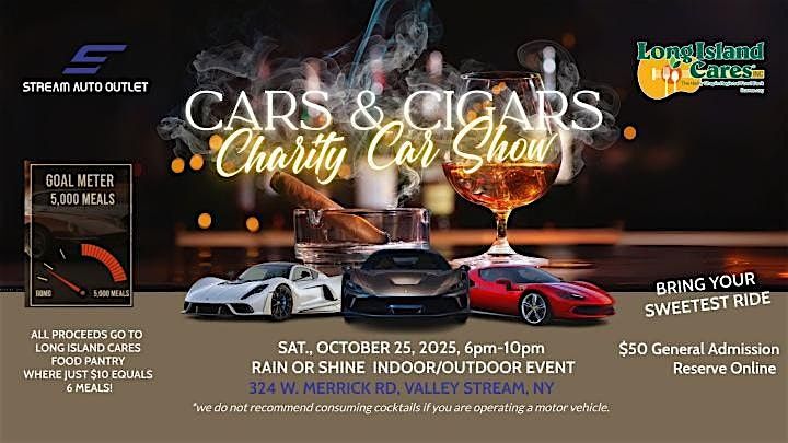 Come enjoy the rides and savor the smoke! This fall we are bringing you something special; featuring the hottest cars as well as an opportunity to taste and take home some of the best cigars!Here's the best part! Have you been wanting to make a difference and give back, but don't exactly know how to start? This is your opportunity to get involved!With Thanksgiving around the corner, Stream Auto Outlet in conjunction with Long Island Cares Food Bank, are extremely thankful and grateful to have the platform to make a difference in our community. We ask you to lend a helping hand to bring thanksgiving dinner to those who are struggling to make ends meet. At long Island Cars, every $10 equals 6 meals! Our goal is to raise 5,000 meals in one flavorful and memorable evening!
