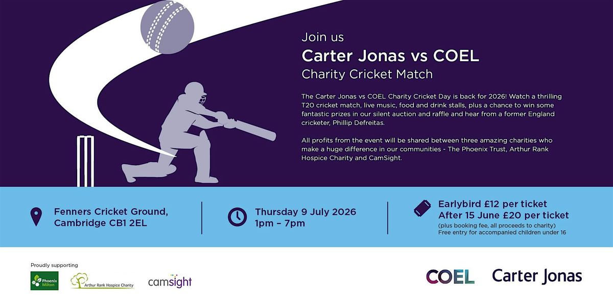 Join us for our annual Carter Jonas VS COEL Charity Cricket Match, as we host a thrilling T20 game, raising money for The Phoenix Trust, Arthur Rank Hospice and CamSight.