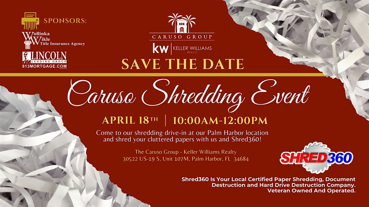 The Caruso Group invites you to our fifth annual, shredding drive-in at our Palm Harbor location on April 18th! Shred all your cluttered papers safely and securely with us and Shred360!🚚