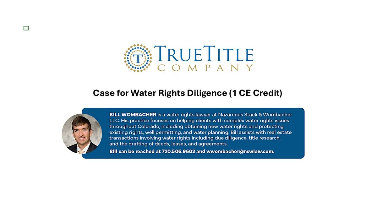 “Case for Water Rights Diligence” will cover the basics of Colorado water law with an emphasis on the importance of performing water rights diligence when water rights are included as part of a real estate transaction. The core of the presentation is a series of real-world examples of the kinds of issues that can be discovered during diligence as well as the problems that can arise when water rights diligence is not performed. Bill will also describe how water rights can be addressed during the diligence period of a transaction to get that transaction to closing. Overall, students will leave class with the ability to better identify possible water rights issues and to understand when it may be prudent to call a water attorney for a diligence assessment.